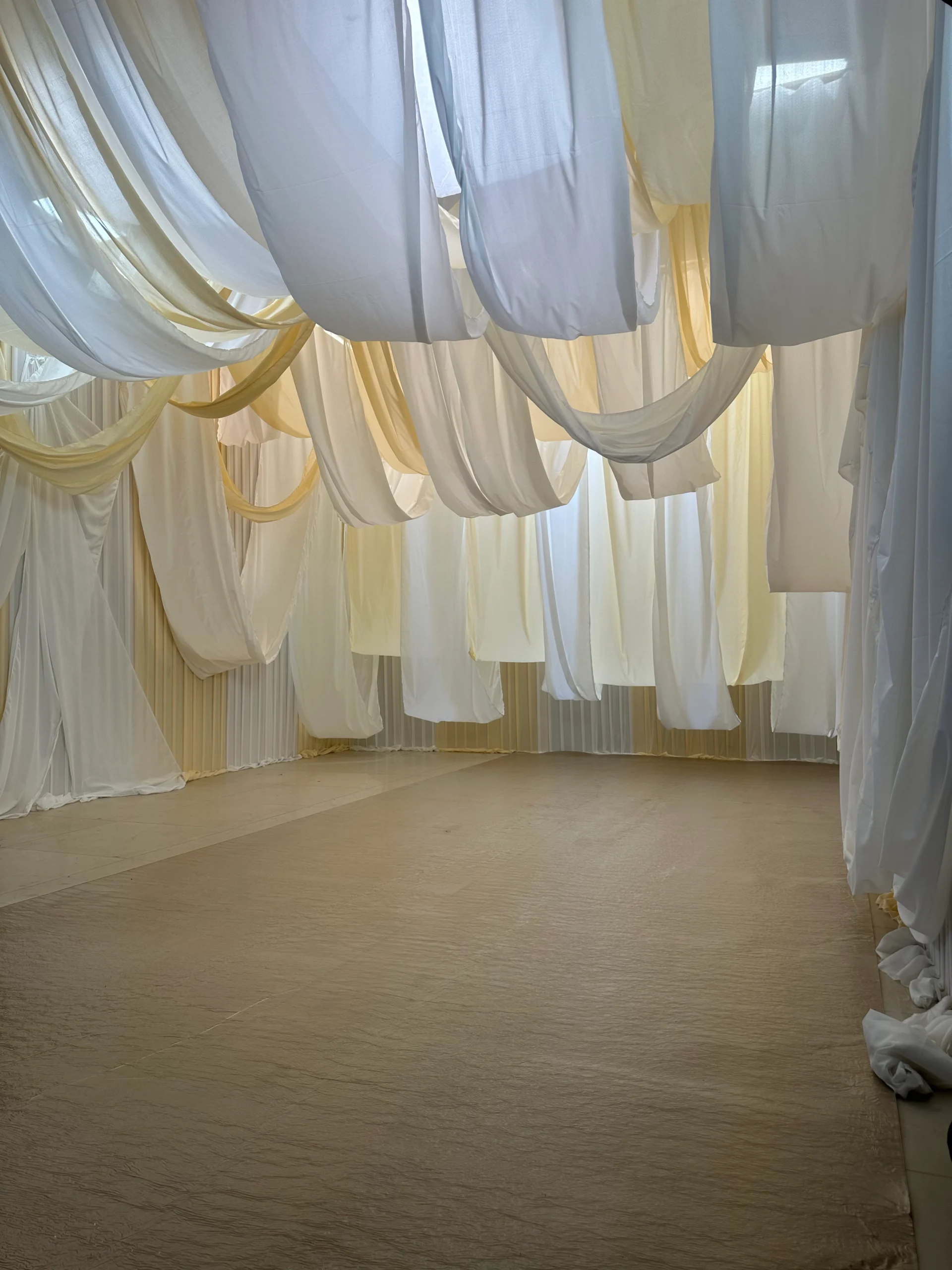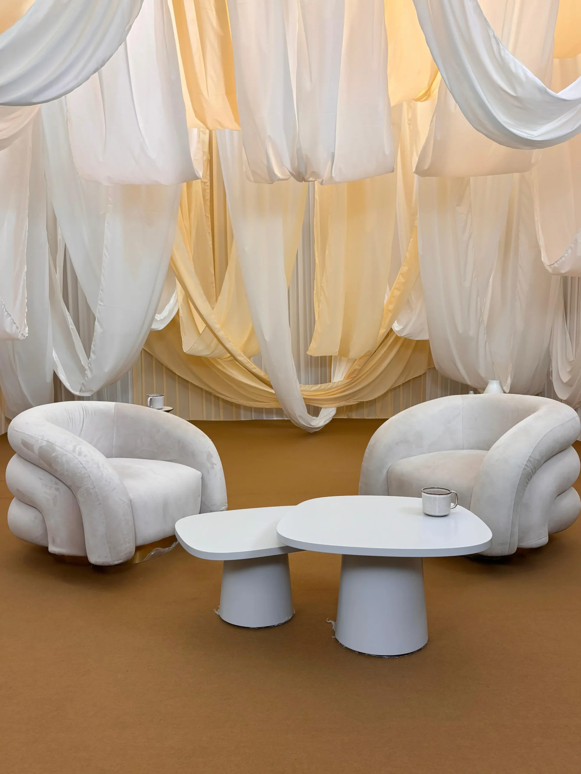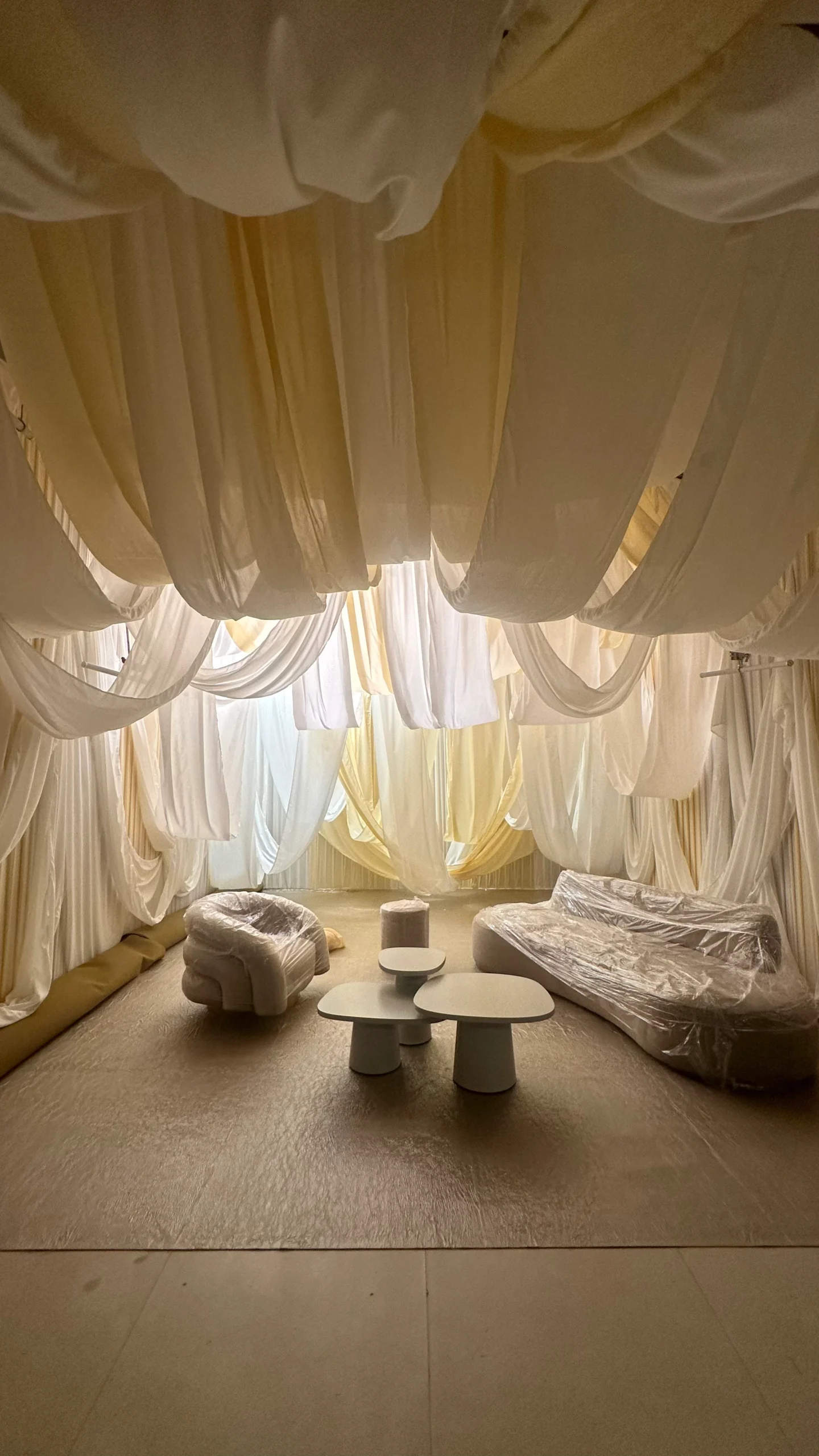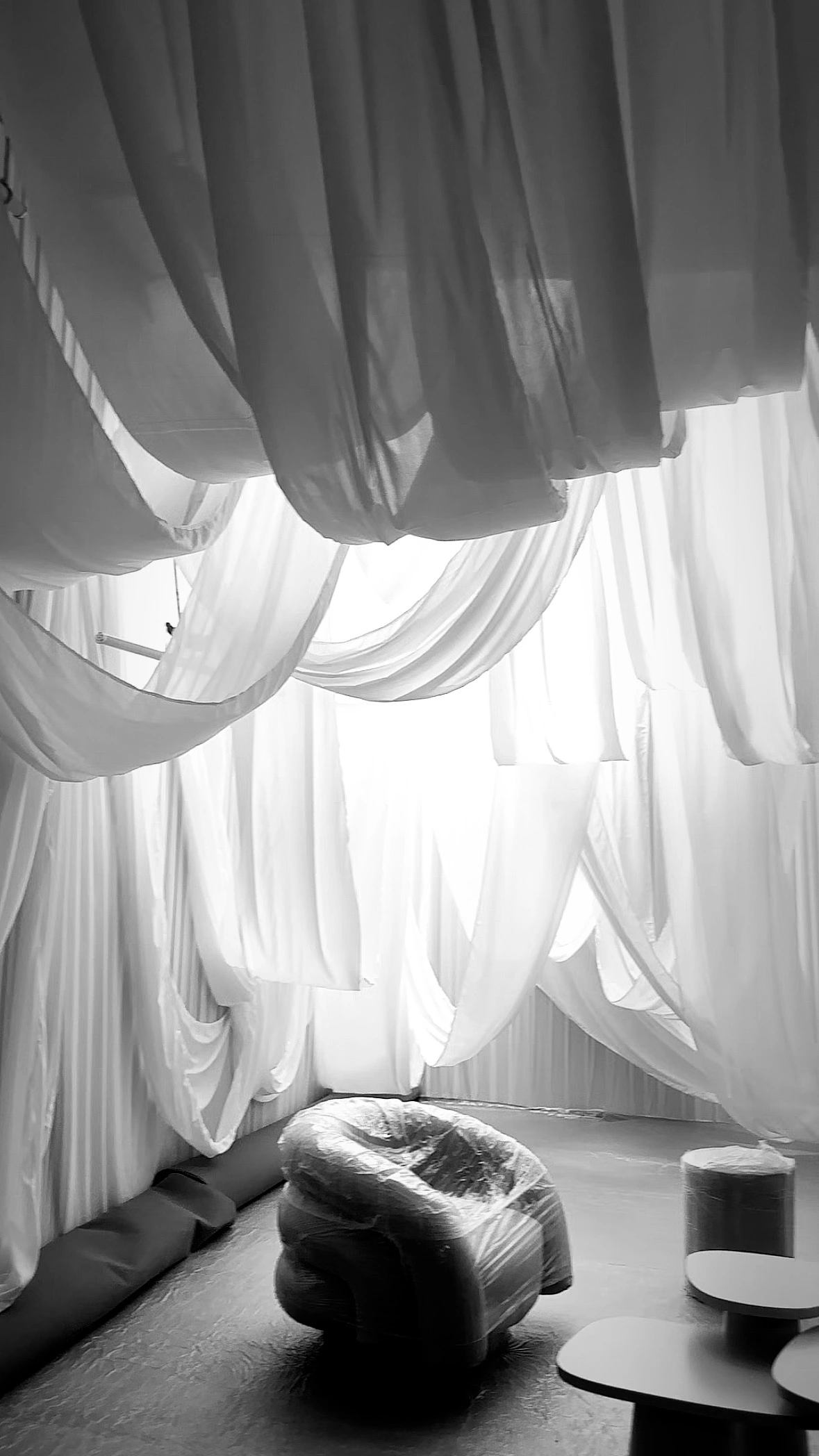 Flowing drapes cascaded from the ceiling, with textured, crease-detailed fabrics adding depth and dimension to the studio space.